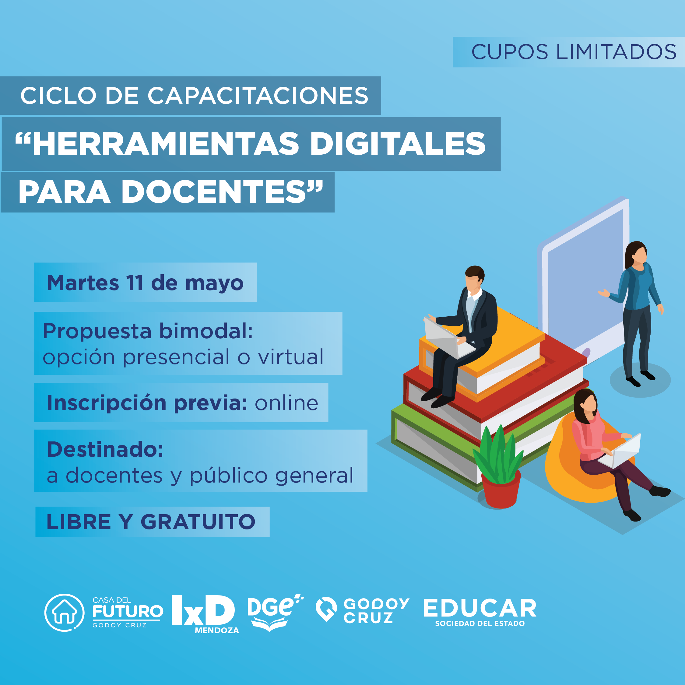 El ciclo de capacitaciones “Herramientas digitales para docentes” estará a cargo de los equipos de Infinito por Descubrir y Casa del Futuro. Tendrá un formato bimodal, es decir que podrán elegir presencial en el Parque TIC Mendoza (Rafael Cubillos y Terrada) o virtual a través de Google Meet.