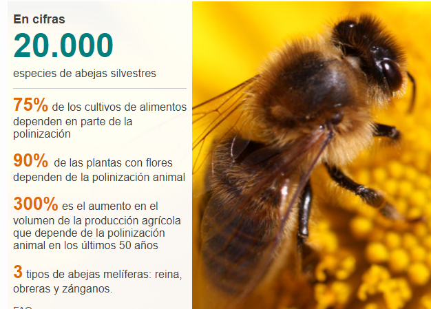 «La falta de abejas provocaría un efecto en cascada: si no tenemos semillas no tendríamos pasto, ni flores, ni frutas, ni animales que se alimentan de frutas. Las abejas y los demás polinizadores juegan un rol fundamental en la regulación de los ecosistemas», le explica a BBC Mundo Carolina Starr, consultora sobre Biodiversidad y Servicios a los Ecosistemas de la Organización de las Naciones Unidas para la Alimentación y la Agricultura (FAO).